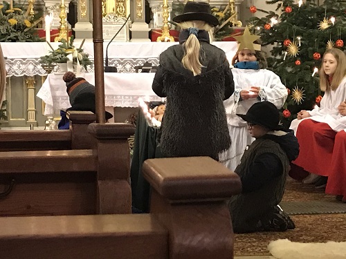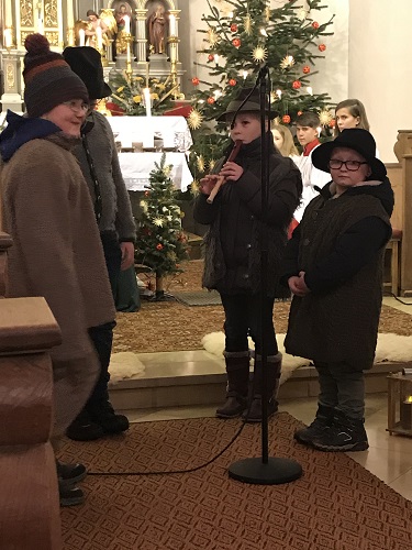 Bei der Weihnachtsmesse am Heiligen Abend in der Pfarrkirche in Stoffenried wurde die Begegnung der Hirten mit dem neu geborenen Jesuskind sehr schön spielerisch dargestellt. Die Hirten sind auf dem Feld und der kleine Hirte übt fleißig auf seiner Flöte, damit er sein Lied dem neuen König der Welt vorspielen kann. Als sie dann dem Ruf des Engels folgen und zur Krippe kommen, ist der kleine Hirte zunächst sehr enttäuscht von den ärmlichen Verhältnissen und er weigert sich sein Flötenlied zu spielen. Als das Jesuskind zu weinen beginnt hat er Mitleid und spielt ihm sein Lied vor. Daraufhin hört das Kind auf zu weinen und lächelt den kleinen Hirten zufrieden an. Mathias und Alexander Walter (Hirten), Darian Konold (Hirte), Bianca Honebeek (kleiner Hirte mit Flöte), Dana Konold (Engel)